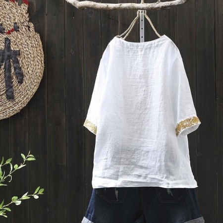 New Literary Retro Golden Embroidery Imitation Cotton Linen Pullover Cotton Short Sleeve T-Shirt Women Loose Top